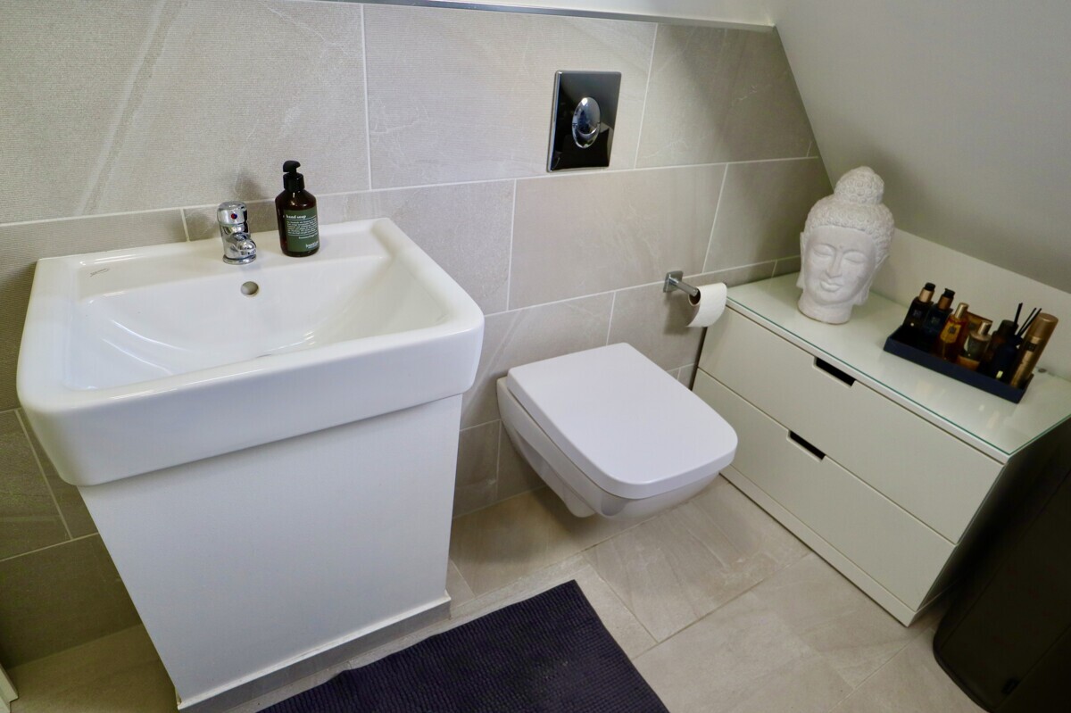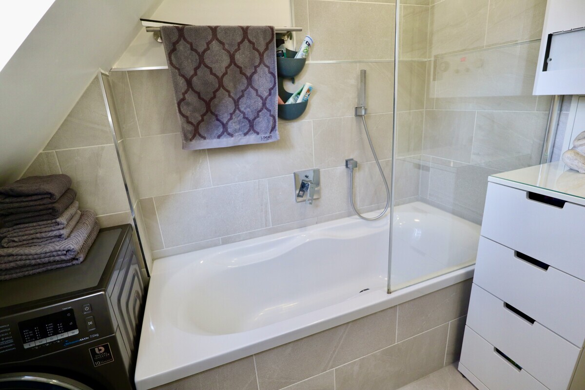 - Tageslichtbad mit großformatigen Fliesen und Badewanne