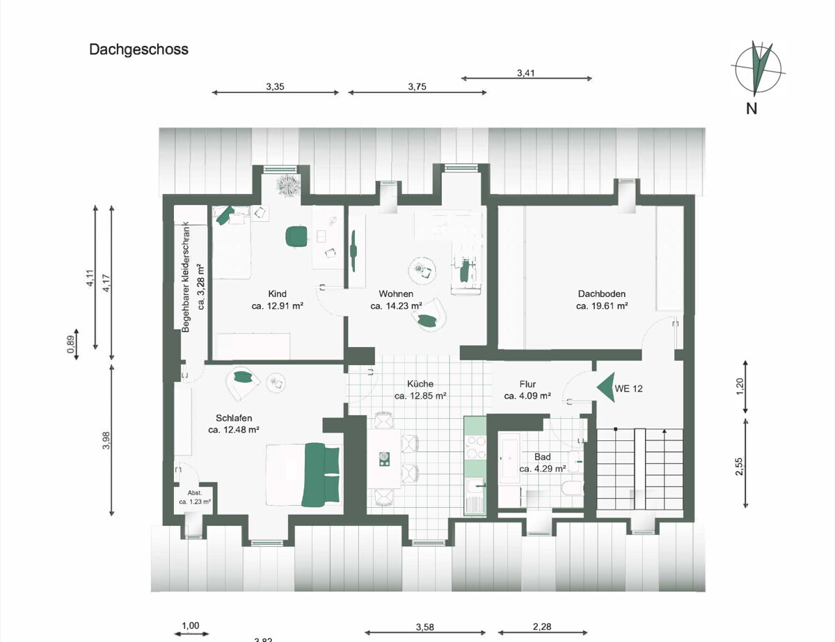 Auf 65,36 m² Wohnfläche entfaltet sich ein durchdachtes Raumkonzept, das mit viel Helligkeit und einem besonderen Wohnflair überzeugt. Der offene Wohn- und Kochbereich mit exklusiver Einbauküche ist das Herzstück der Wohnung – ein Ort, an dem Kochen, Wohnen und Genießen nahtlos ineinander übergehen. Gauben und Dachfenster mit integriertem Sonnenschutz lassen viel Licht herein, öffnen den Blick und schaffen eine Atmosphäre, die Weite und Geborgenheit zugleich ausstrahlt.