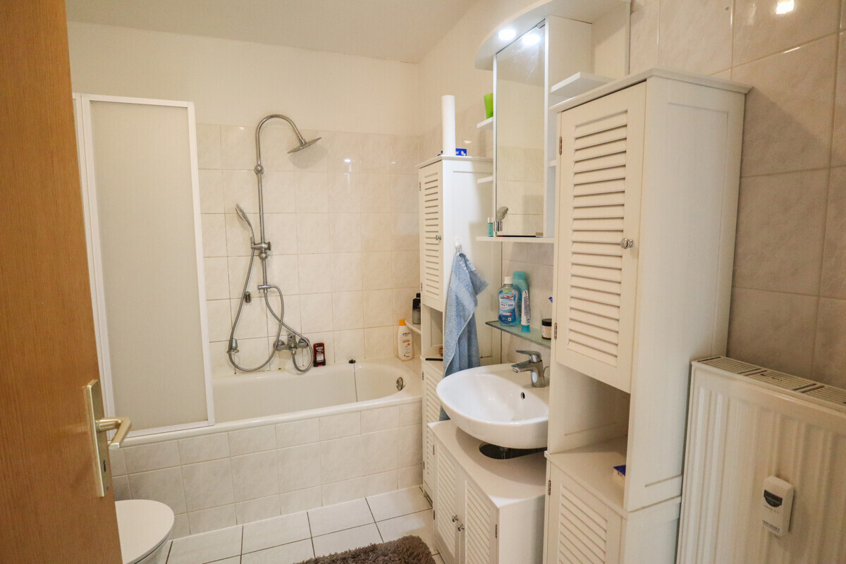 Ein Badezimmer mit Badewanne, ein praktischer Kellerraum sowie ein eigener PKW-Stellplatz runden das attraktive Gesamtpaket ab.